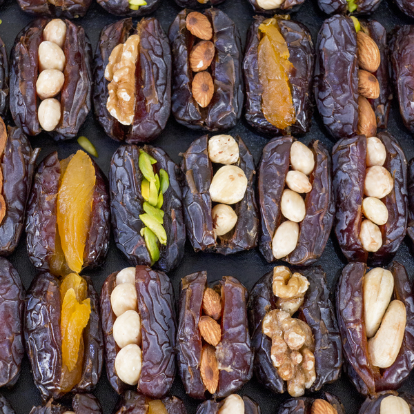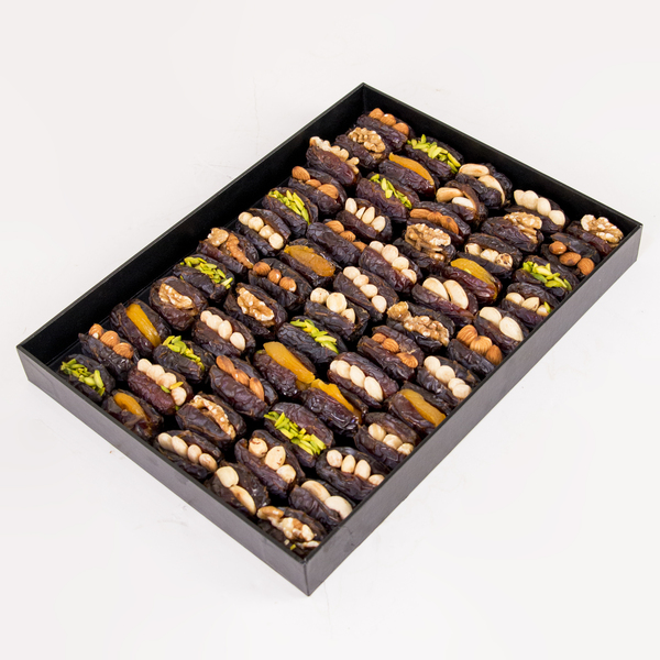 An 1kg elegant assortment of hand-stuffed premium dates, featuring a sophisticated blend of crunchy nuts and vibrant dried fruits. Perfectly presented in our signature gold-stamped noir gift box, this collection offers a refined balance of natural sweetness and artisan craftsmanship—an exquisite gift for any occasion.