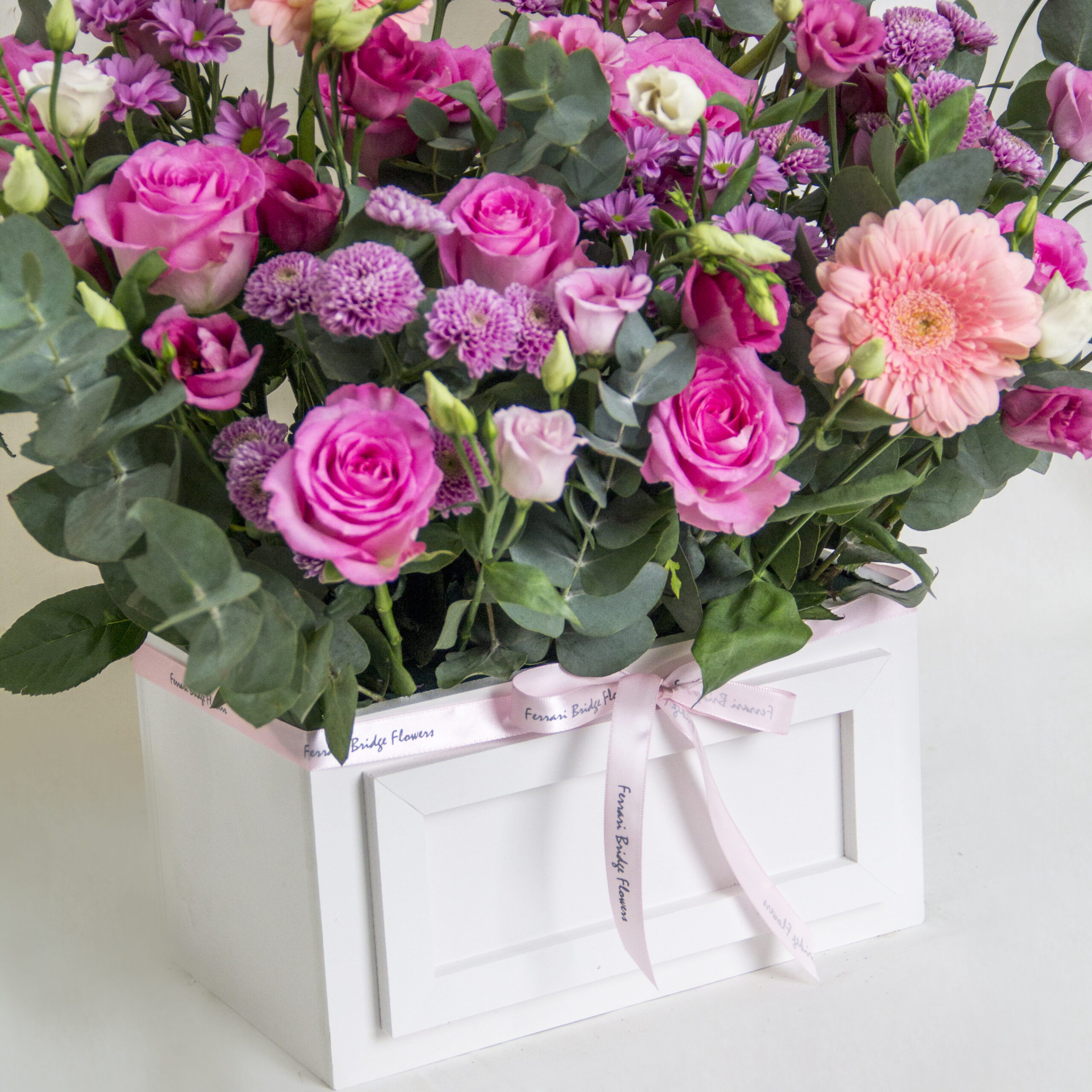 A wooden box arrangement of pink and peach mix flowers
