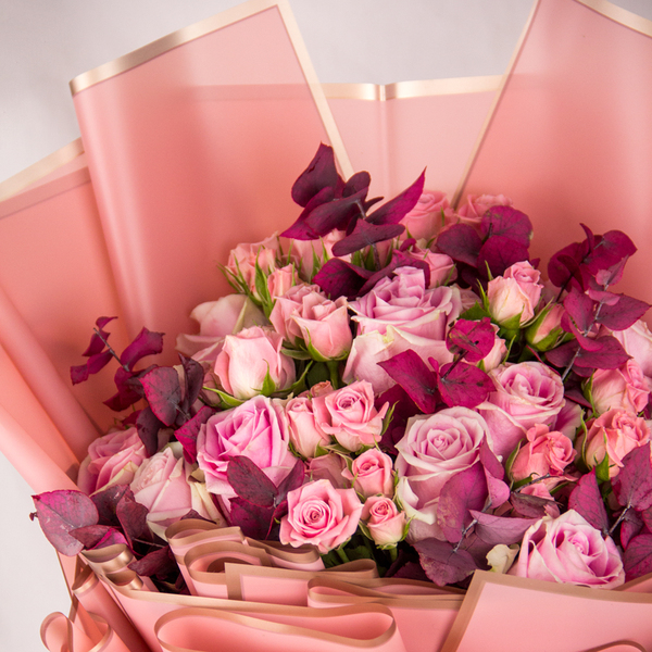 Hand bouquet of pink roses, pink spray roses and eucalyptus leaves.