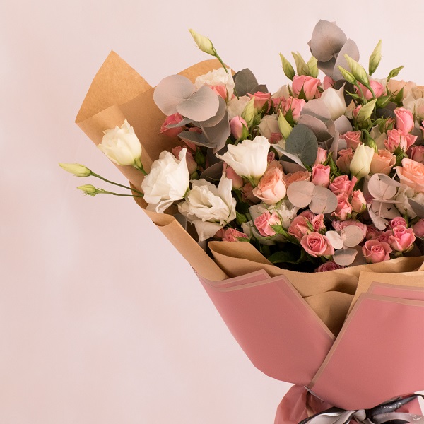 A beautiful bouquet mixed with Pink and white flowers delicately enfold with pink and natural color wrapping