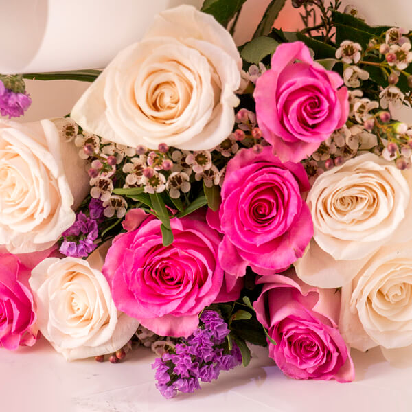 A charming and delicate hand-tied bouquet featuring a mix of creamy white and vibrant pink roses. Accented with dainty waxflowers and purple statice, this arrangement is elegantly wrapped in soft white and pink tissue, making it a perfect gift for birthdays or “just because” moments.