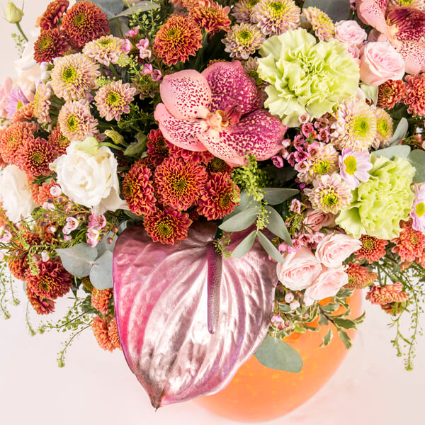 A lush, multi-textured bouquet featuring vibrant Vanda orchids, lime-green carnations, and deep-toned spray mums. This abundant arrangement is beautifully displayed in a large, terracotta-orange ceramic vase, making it a perfect statement piece for any room.